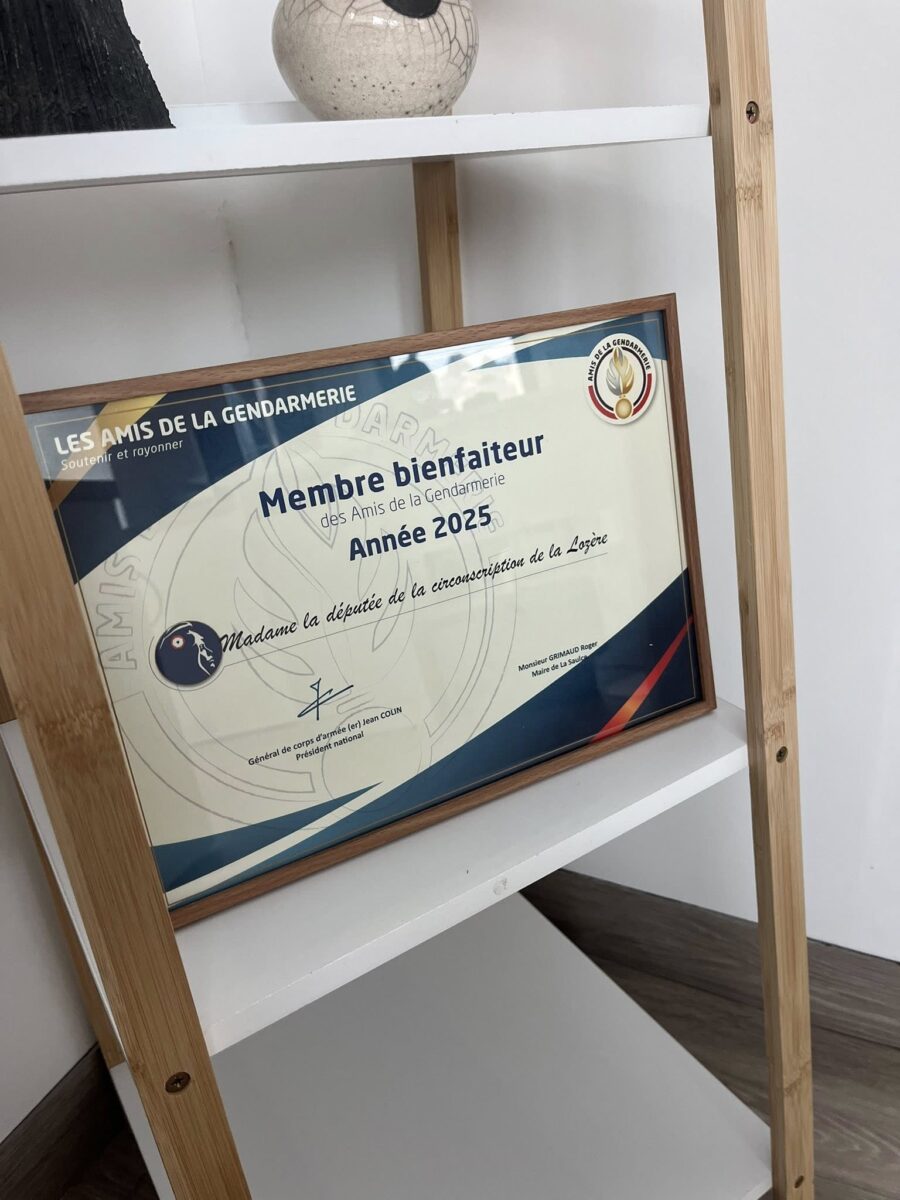 Enfin, la députée a eu l’honneur de recevoir le diplôme « membre bienfaiteur », remis par Monsieur Henri Munier, Président des Amis de la Gendarmerie, en reconnaissance de son engagement et de son soutien.