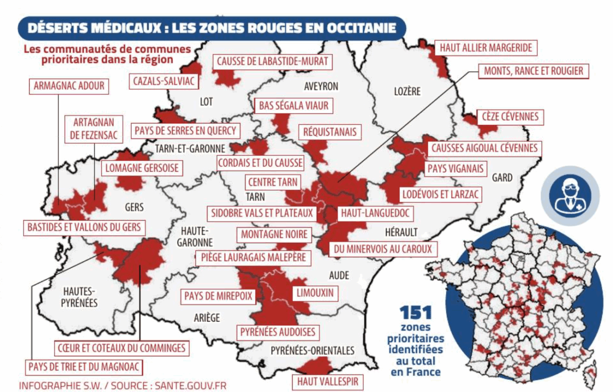 Ce constat rejoint les données publiées au niveau national : en Occitanie, de nombreuses communautés de communes apparaissent en rouge sur la carte des déserts médicaux. La Lozère n’est pas épargnée, avec notamment le Haut-Allier Margeride identifié comme particulièrement fragile.