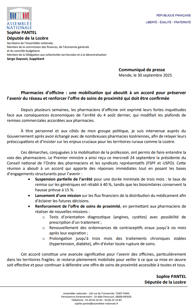 À titre personnel et aux côtés de son groupe politique, Sophie Pantel est intervenue auprès du Gouvernement après avoir échangé avec de nombreuses pharmacies lozériennes, afin de relayer leurs préoccupations et d’insister sur les enjeux cruciaux pour les territoires ruraux comme la Lozère.
